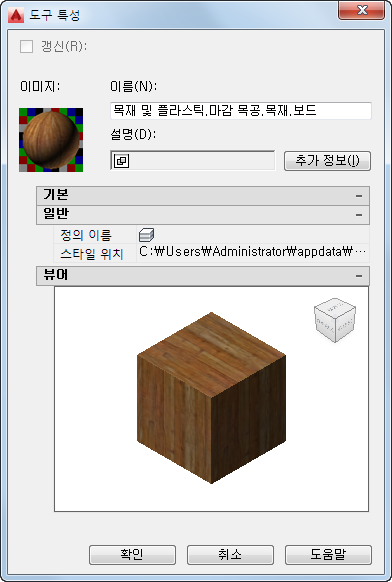 주: 템플릿으로 선택하는 재료 정의는 렌더링 재료를 제외하고 모든 초기 재료 설정을 정의합니다. 여기에는 도면층, 색상 및 선종류 설정, 해칭, 표면 해치 할당값 그리고 단면에서 사용 시 재료의 동작이 포함됩니다.