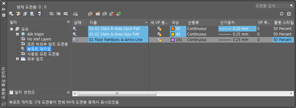 - 명령행에 VPLAYEROVERRIDES를 입력하여 현재 뷰포트에 도면층 특성 재지정이 있는지를 확인합니다. VPLAYEROVERRIDES가 1이면 뷰포트에 재지정이 있는 것입니다.