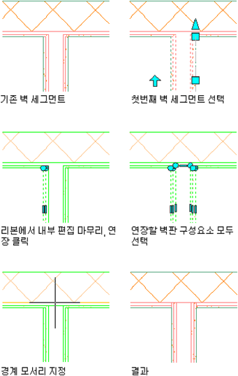 다음 절차에 따라 구성요소를 연장하여 벽 교차를 수정하십시오. 연장 경계는 선, 호, 원, 폴리선 또는 벽 구성요소 모서리일 수 있습니다.