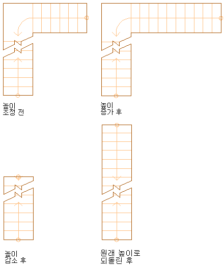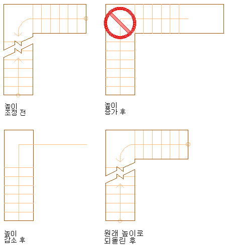 다음 그림은 높이 변경 전/후 StairFit 옵션이 사용 불가능한 직선 계단의 예를 보여줍니다.