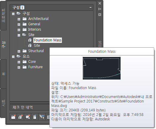 프로젝트 네비게이터에서는 프로젝트 도면의 썸네일 미리보기를 표시할 수 있습니다. 미리보기는 그래픽이나 상세 정보 또는 이 두 가지의 조합일 수 있습니다. 여러 도면이 있는 큰 프로젝트를 탐색하는 경우 썸네일을 표시하면 유용할 수 있습니다.