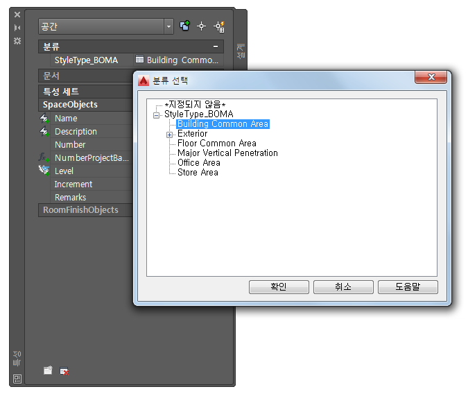예를 들어 도면에 BOMA 영역 계산 표준을 선택한 경우 BOMA 분류 정의가 표시됩니다.