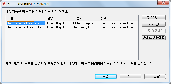 선택한 데이터베이스가 키노트 데이터베이스 추가/제거 대화상자에 있는 리스트 맨 아래에 추가됩니다. 위로 이동 및 아래로 이동 버튼을 클릭하여 리스트에서 선택된 데이터베이스 위치를 변경함으로써 데이터베이스가 검색되는 순서를 지정할 수 있습니다. 리스트의 맨 위로 데이터베이스를 이동하면 키노트 선택 대화상자의 기본 선택사항이 됩니다.