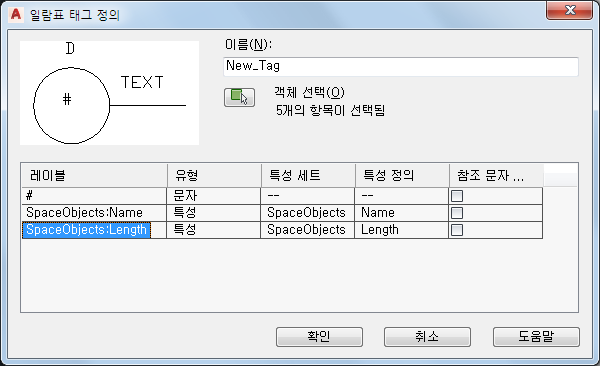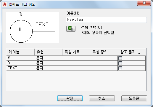 다음 절차에 따라 도면의 특정 객체에 대한 특성 세트 데이터를 캡처하고 표시하는 일람표 태그를 작성하십시오.