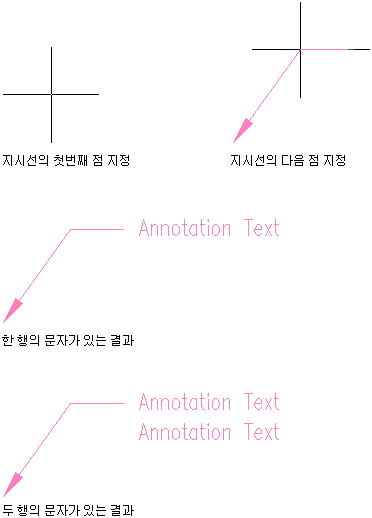 다음 과정에 따라 도면 영역에 지정할 점을 가리키는 단일 지시선이 있는 여러 줄 문자 객체를 추가하십시오. 지시선은 폴리선과 같은 방식으로 그려지므로 직선 세그먼트를 삽입할 두 개의 점을 지정합니다. 또는 제한 점 특성에 대한 설정에 따라, 두 개 이상의 세그먼트로 구성되는 각이 있는 지시선을 삽입할 점을 추가로 지정할 수 있습니다.
