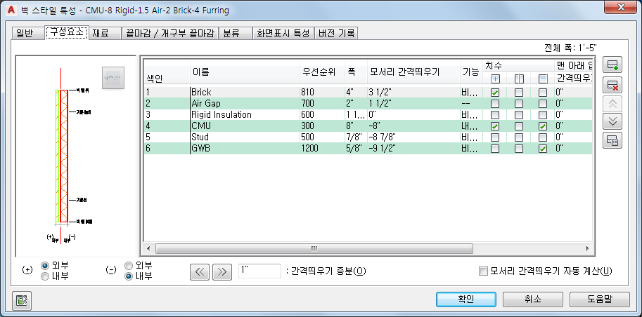 벽 스타일 대화상자의 구성요소 탭을 사용하여 벽 구성요소를 지정하는 도중 확인할 수 있습니다.