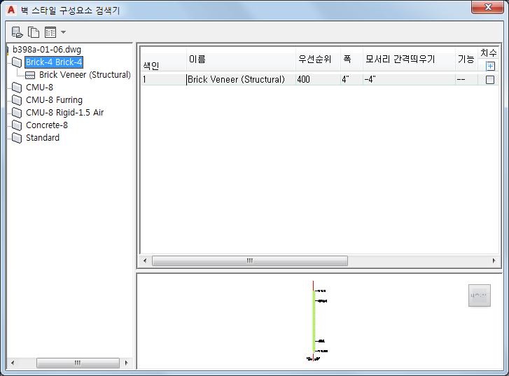 각 특성을 지정하여 벽 구성요소를 작성하면서, 다른 벽 스타일의 구성요소를 벽 스타일으로 복사할 수 있습니다. 벽 구성요소 브라우저는 다른 벽 스타일의 구성요소를 본 다음 편집 중인 벽 스타일에 구성요소를 복사할 수 있도록 해주는 유틸리티입니다.