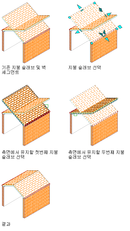 다음 절차에 따라 교차하는 두 슬래브 또는 지붕 슬래브를 연귀이음하십시오. 두 개의 슬래브 또는 지붕 슬래브는 둘레선의 교차부분을 따라 잘려집니다. 필요한 경우 정점이 추가되거나 제거됩니다. 슬래브 또는 지붕 슬래브의 새 모서리는 정확한 연귀이음 및 절단을 위해 필요한 각도로 설정됩니다. 두 개의 모서리의 슬래브 두께가 다를 경우 각도가 다릅니다.