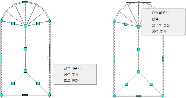 모서리 그립에는 간격띄우기, 정점 추가, 호로 변환, 선으로 변환 및 신축의 5가지 편집 모드가 있습니다.