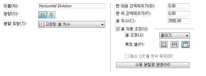 그리드에서 고정된 셀 크기를 지정할 때, 그리드의 셀이 남은 공간을 수용하도록 조정하는 방법을 조정할 수 있습니다. 이 공간은 커튼월 단위의 길이(또는 높이)를 셀의 고정된 크기로 균등하게 분할할 수 없는 경우 나타납니다.