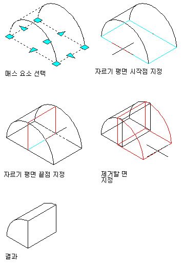 다음 과정에 따라 매스 요소를 자르십시오. 지정한 부속건물 평면도는 자르기 선 역할을 하고 제거할 매스 요소의 면을 지정합니다.