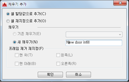 | 셀 재지정으로 추가하고 도면에 있는 스타일과 다른 스타일의 문 또는 창을 삽입한 다음 객체 주위의 프레임 모서리 제거하지 않기 | 새 채우기를 선택하고 객체 이름을 입력한 후 확인을 클릭합니다. |