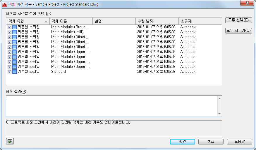 프로젝트 표준 도면에 있는 모든 스타일 및 화면표시 설정의 버전을 한 번에 관리할 수 있습니다.