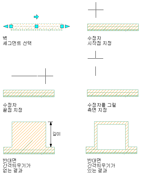 벽의 한 면 또는 양면에 벽 수정자를 추가할 수 있습니다. 면을 선택할 경우 또한 반대편 면에서 벽 수정자의 간격을 띄움으로써 파이프 채이스 또는 인테리어 열과 같은 돌기를 작성할 수 있습니다.