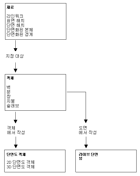 2D 및 3D 단면 객체는 재료별로 결정될 수 있는 여러 화면표시 구성요소로 구성됩니다.