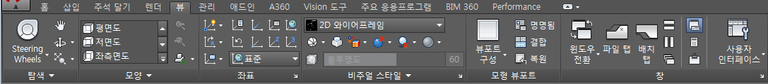 - 모양에서는 미리정의된 뷰를 선택하고 새 뷰를 작성하며 뷰 관리자를 열고 비주얼 스타일을 선택하고 비주얼 스타일 관리자를 열고 보행시선 및 조감뷰 설정을 정의할 수 있습니다. 미리정의된 화면표시 주제에 액세스할 수 있습니다. 또한 자르기 평면을 조정하고 재생성 명령에 액세스할 수 있습니다.