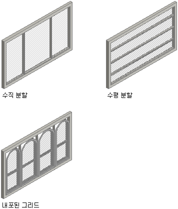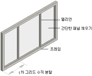 조합창/문은 창 및 문과 같은 객체를 삽입하는 그리드 또는 프레임워크를 제공합니다. 이 프레임워크를 사용하여 복잡한 조합창/문을 작성한 후 표준 벽에 삽입하거나 커튼월의 반복되는 요소로 사용할 수 있습니다.