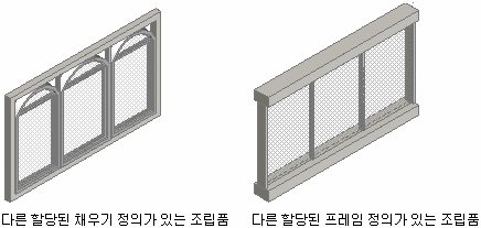 새 요소 정의를 작성한 후 해당 정의를 조합창/문 내에 지정할 수 있습니다. 예를 들어, 다중 채우기 정의를 작성한 후 그리드의 특정 셀에 서로 다른 채우기를 지정할 수 있습니다. 또한 다중 프레임 정의를 작성한 후 각 프레임 모서리(맨 위, 맨 아래, 왼쪽, 오른쪽)에 서로 다른 정의를 지정할 수 있습니다. 이것은 멀리언 정의에도 적용됩니다.