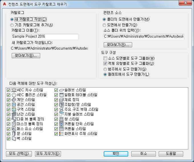 주: 두 옵션이 모두 활성화되면 먼저 카탈로그가 도면별로 그룹화된 후 객체 유형별로 그룹화되며 도면에서 범주가 생성되고 객체 유형에서 팔레트가 생성됩니다. 팔레트는 중첩될 수 없으므로 이와 같은 과정이 진행됩니다. 이 경우 범주 및 팔레트에 대한 라디오 버튼이 비활성화되고 카탈로그에 대해 팔레트에서 도구 작성 옵션이 선택됩니다.