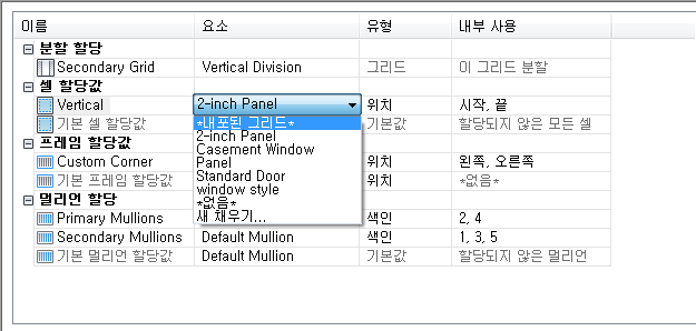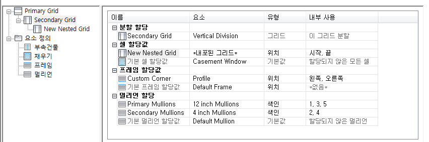 다음 과정에 따라 커튼월 단위에 내포된 그리드를 작성하십시오. 내포된 그리드는 그리드 내에 있는 그리드입니다. 내포된 각 그리드에는 자체 분할, 셀 할당값, 프레임 및 멀리언이 있습니다. 기본적으로 내포된 그리드에는 프레임이 선택되어 있지 않습니다.
