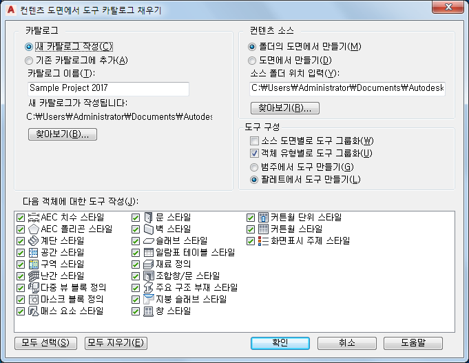 주: 두 옵션 모두 활성화된 경우 먼저 카탈로그가 도면별로 그룹화된 다음 객체 유형별로 그룹화되어 도면에서 범주가 생성되고 객체 유형에서 팔레트가 생성됩니다. 팔레트는 중첩될 수 없으므로 이와 같은 과정이 진행됩니다. 이 경우 범주 및 팔레트에 대한 라디오 버튼이 비활성화되고 카탈로그에 대해 팔레트에서 도구 작성 옵션이 선택됩니다.