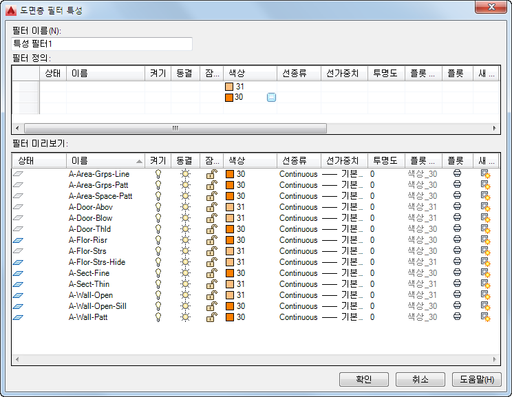 다음 절차에 따라 특성 필터를 작성하십시오. 하나의 그룹에 대해 두 개 이상의 필터를 지정할 수 있습니다. 예를 들어, 도면층 이름 및 상태별로 필터링하여 동결된 모든 벽 도면층을 그룹화할 수 있습니다.