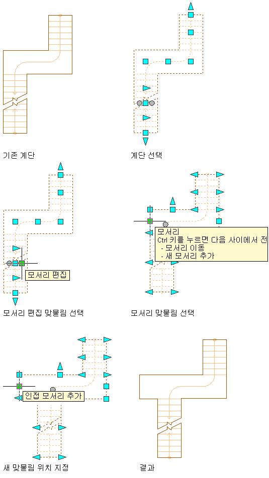 계단참은 새 쉐이프로 변경됩니다. 계단참과 계단이 정점 그립을 공유할 경우 계단은 계단참과 함께 이동합니다.