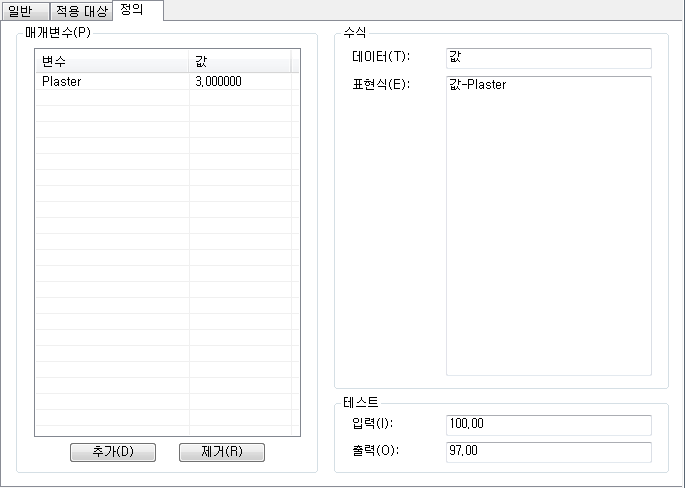 를 클릭합니다. 변수는 변수 이름과 변수 값으로 이루어집니다. 예를 들어, 3%의 회반죽 감소를 작성하려면, 추가를 클릭하고 변수로 Plaster_Deduction을 입력하고 값으로 0.97을 입력합니다.