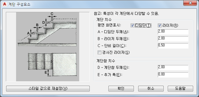 다음 과정에 따라 각각의 계단에 대해 디딤단 및 라이저 두께 그리고 단비 길이를 변경하십시오. 또한 디딤단 및 라이저의 화면표시를 켜거나 끌 수 있습니다.