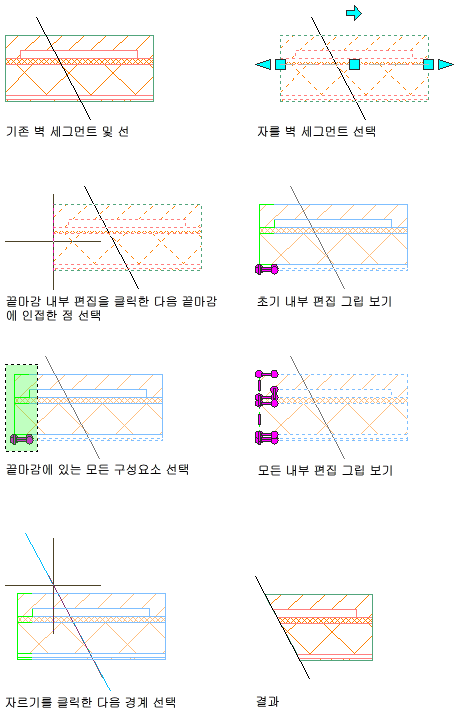 다음 과정에 따라 구성요소를 잘라 벽 끝마감을 수정하십시오. 자르기 경계는 선, 호, 원, 폴리선 또는 벽 구성요소 모서리일 수 있습니다.