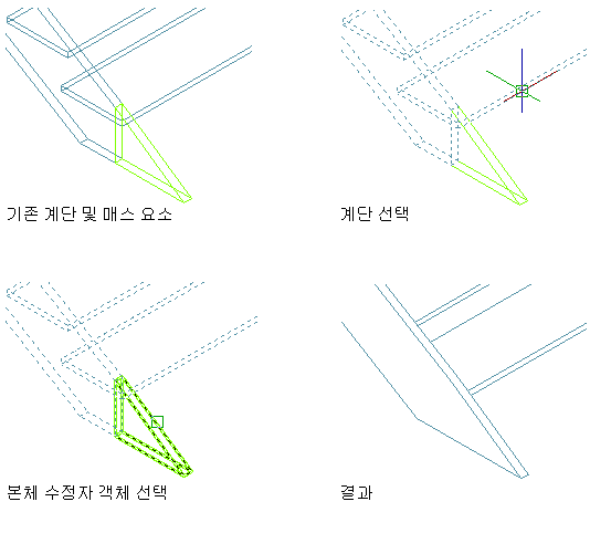 다음 그림에서는 계단옆판 구성요소에 추가하는 본체 수정자로 매스 요소를 사용하는 방법을 보여줍니다.