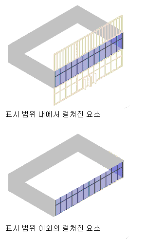 레벨이 커튼월 또는 승강기 통로와 같은 스패닝 요소에 의해 교차되는 경우 실제로 해당 레벨 위에 있는 스패닝 요소의 일부만 표시하려고 합니다. 이런 객체 및 사용자 정의된 화면표시 범위 내의 객체 범위만 표시하는 잘린 모형 뷰를 작성할 수 있습니다.