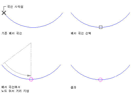| 지정된 위치에 노드 배치 | Enter 키를 누릅니다. 노드 수를 입력한 후, 노드를 선택하거나 곡선의 시작 점에서 거리를 입력하여 노드의 위치를 지정합니다. |