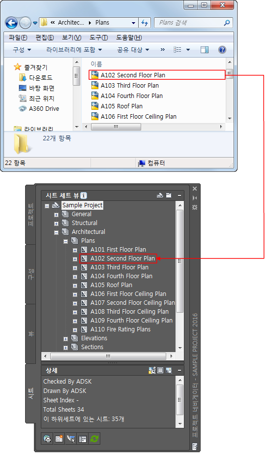 - 폴더를 프로젝트 네비게이터에서 선택된 탭의 도면 탐색기에 놓습니다.