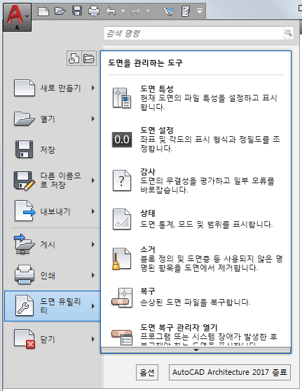 응용프로그램 메뉴에는 열기, 저장, 인쇄 및 내보내기와 같은 전반적으로 도면과 관련된 기본적인 명령이 들어 있습니다. 이를 대치하는 메뉴 검색기와 마찬가지로 응용프로그램 메뉴는 작업공간의 왼쪽 위 구석에 있는