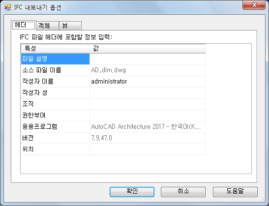 화면에서 활성화된 도면의 이름이 IFC 내보내기 옵션 대화상자의 헤더 탭에 표시됩니다. 도면에 대한 설명, 작성자 및 회사 이름, 권한부여 데이터, 건물의 지리적 위치와 같이 내보낼 도면 파일에 대한 정보를 추가할 수 있습니다. 예를 들어 헤더 탭에 구조 도면에 대한 설명을 Structure for Commercial Building 152로 입력할 수 있습니다. 이 정보는 IFC 파일을 볼 때 파일의 헤더에 표시됩니다.