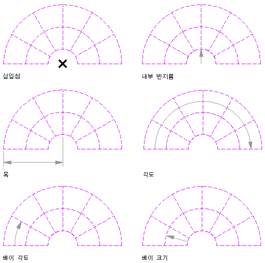 - 배치 유형에 대해 균등히 간격두기를 선택하고 베이 수에 대한 값을 입력하거나, 반복을 선택하고 베이 각도, 시작 각도 간격띄우기 및 끝 각도 간격띄우기에 대한 값을 입력합니다.