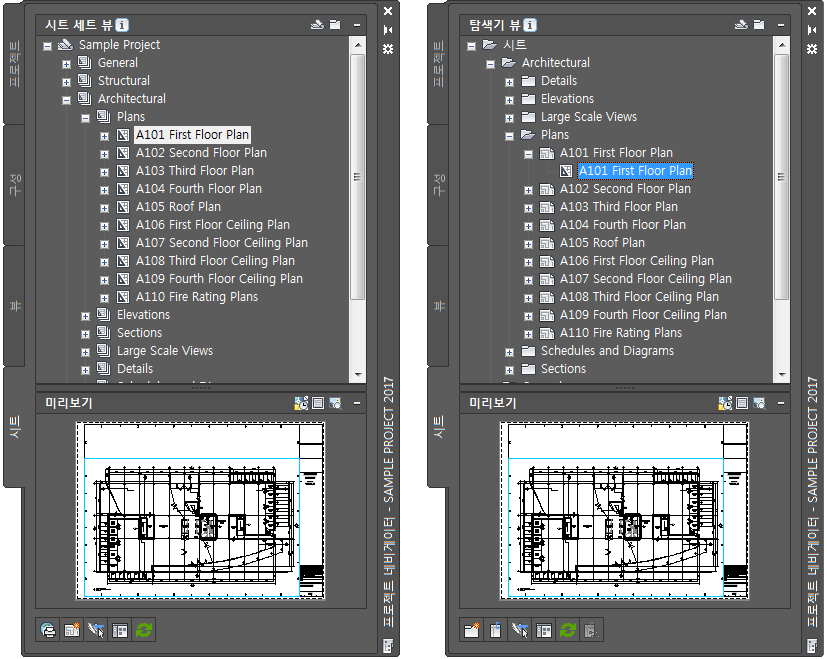 프로젝트의 시트 세트 뷰(왼쪽) 및 탐색기 뷰(오른쪽)가 있는 시트 탭