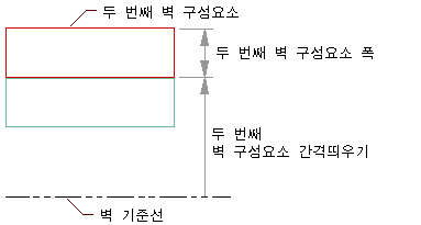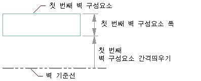 주: 벽 맨 위보다 높거나 벽 맨 아래보다 낮은 입면 간격띄우기로 벽 구성요소를 정의하지 마십시오. 이러한 방식으로 정의된 구성요소를 가진 벽은 올바르게 마무리되지 않으며 그 지붕 선 또는 바닥판 선을 편집하는 경우 올바르게 표시되지 않을 수 있습니다. 마무리 및 표시 문제가 발생하지 않도록 기준 입면 위 또는 기준선 아래의 입면 간격띄우기로 벽 구성요소를 정의할 수 있습니다.