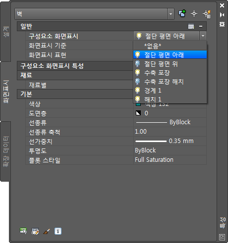 또한 특성 팔레트의 화면표시 탭을 사용하여 현재 화면표시 표현에 선택된 객체의 화면표시 특성 설정을 변경할 수 있습니다. 전체 객체에 적용되는 특성에 대한 설정(예: 절단 평면 높이) 및 객체의 개별 화면표시 구성요소에 대한 설정(예: 해치 구성요소에 대한 색상, 도면층 및 선종류)을 변경할 수 있습니다.