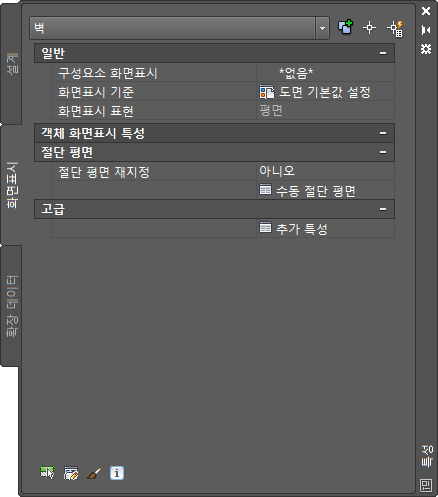 - 변경할 화면표시 특성에 대해 새 값을 입력하거나 선택합니다. 변경 결과는 도면 영역에 바로 표시됩니다. 화면표시 탭에 표시되는 특성은 선택된 객체와 구성요소에 따라 다릅니다. 대부분의 특성은 자체적으로 설명이 됩니다. 특정 객체 유형의 화면표시 특성 수정에 대한 자세한 내용은 관련 도움말 항목(예: 벽 또는 문)을 참고하십시오. 각 객체 항목에는 화면표시 특성의 해당 범주에 대한 하위 항목이 있습니다.