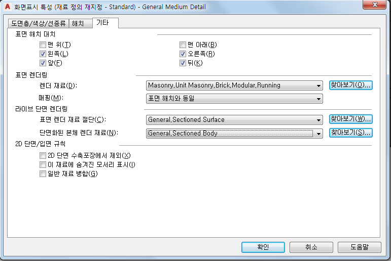 을 사용하면 표면 해치 배치 및 표면 렌더링과 같은 재료 정의와 연관된 화면표시 특성을 보거나 수정할 수 있는 대화상자에 액세스할 수 있습니다.