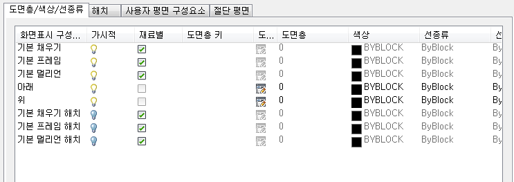 | 절단 평면 높이의 값보다 낮은 높이 | 객체는 도면층/색상/선종류 탭의 절단 평면 아래 구성요소에 대해 지정된 특성을 사용하여 표시됩니다. |