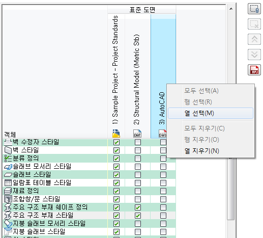 팁: 모든 스타일 유형에 대해 하나의 도면을 선택하려면 헤더를 마우스 오른쪽 버튼으로 클릭하고 열 선택을 클릭합니다.