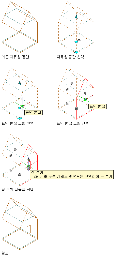 주: 표면 편집 모드를 종료한 후에 개구부가 표시되지 않으면 공간 스타일이나 공간 객체 화면표시 특성에서 표면 구성요소 화면표시 구성요소가 활성화되지 않은 것입니다.