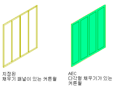 AutoCAD Architecture에서 커튼월 객체는 하나 이상의 그리드로 구성됩니다. 각 그리드에는 패널이나 창 또는 문과 같은 객체로 채울 수 있는 셀이 있습니다. AEC 폴리곤은 커튼월에 대한 패널 채우기를 작성하는 데 가장 이상적입니다.