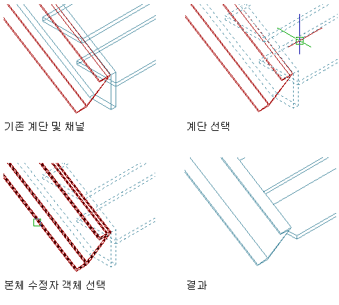 다음 그림에서는 계단옆판 구성요소를 대치할 본체 수정자로 채널을 사용하는 방법을 보여줍니다.