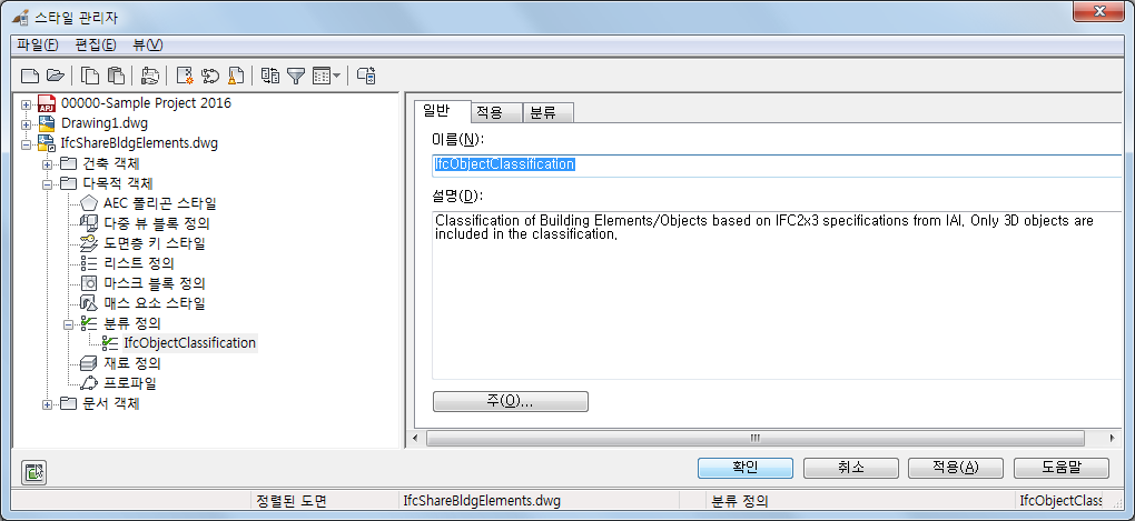이 도면을 IFC 파일 형식으로 내보내면 분류 정의도 내보내집니다. 도면을 가져올 때 분류 정의가 객체 유형에 부착됩니다.