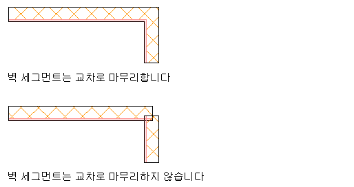 벽 마무리 그룹 정의는 교차하는 벽의 마무리 방식을 조정하기 위해 각 벽에 할당할 수 있는 지정입니다. 동일한 마무리 그룹에 속하는 벽은 교차하는 지점에서 각 벽의 각 구성요소에 할당된 우선순위에 따라 마무리됩니다. 다른 마무리 그룹에 속하는 벽은 구석에서 만나거나 교차할 때 마무리되지 않습니다.