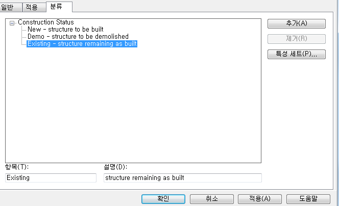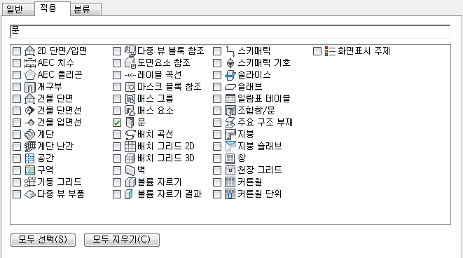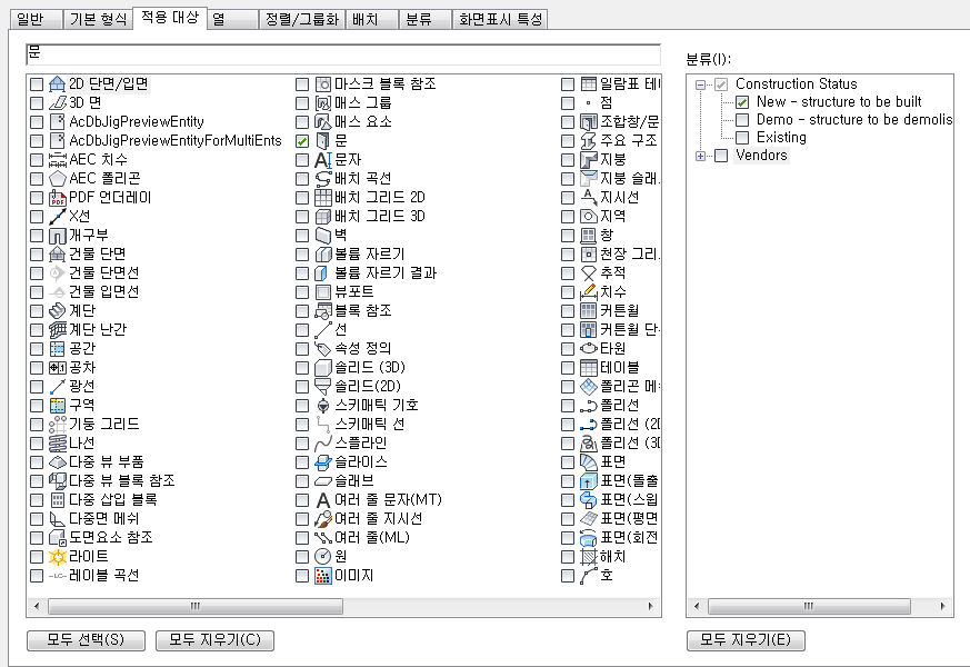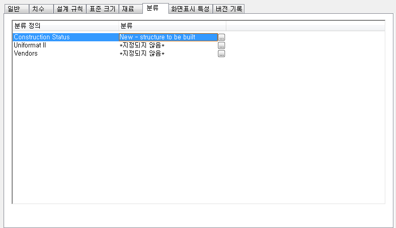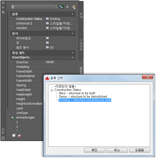 분류 정의가 객체 스타일 특성의 분류 탭에 나열됩니다. 객체 스타일에서 New와 같은 분류를 선택합니다. 예를 들어, 도면에 기존 문에 대한 하나의 문 스타일을 포함하고 새 구성에 대한 다른 스타일을 포함할 수도 있습니다. 이런 스타일으로 작성된 모든 문은 해당 스타일에 지정된 분류를 갖게 됩니다.